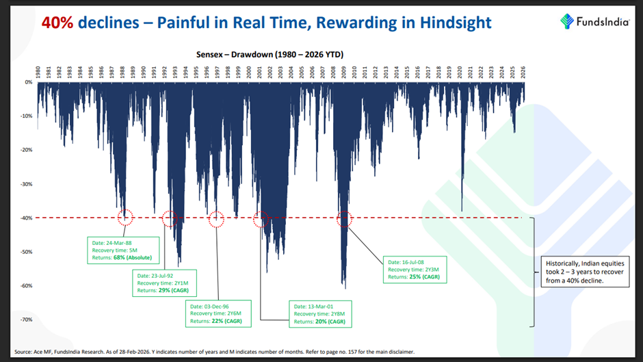 Source: Ace MF, FundsIndia Research — Every 40%+ decline recovered within 2–3 years, returns of 20–68%