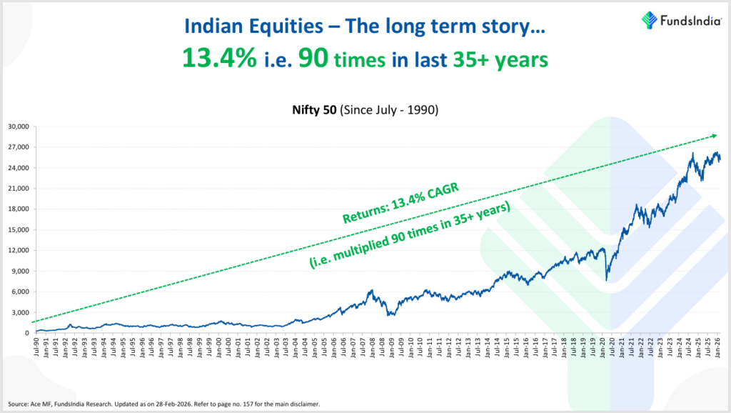 The Sensex went from under 2,000 in 1990 to over 85,000 by 2026. Every single one of those ‘reasons to stay out’ was eventually overcome by the underlying strength of the economy and corporate earnings.
